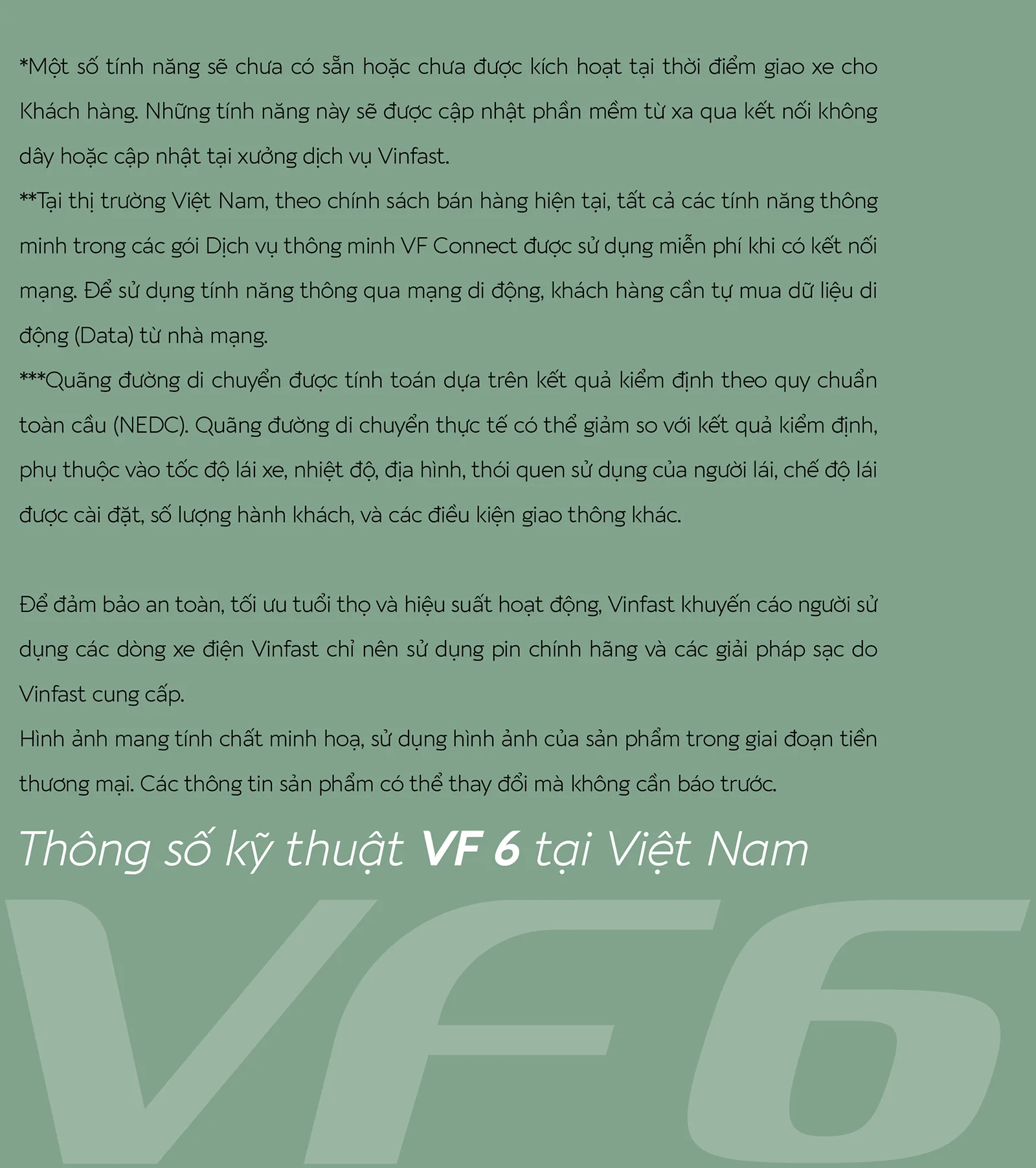 Với sức mạnh của động cơ điện tương đương với những mẫu xe thuộc phân khúc C-SUV, VF 6 chắc chắn sẽ thỏa mãn niềm đam mê cầm lái của chủ sở hữu, tự tin chinh phục mọi địa hình.